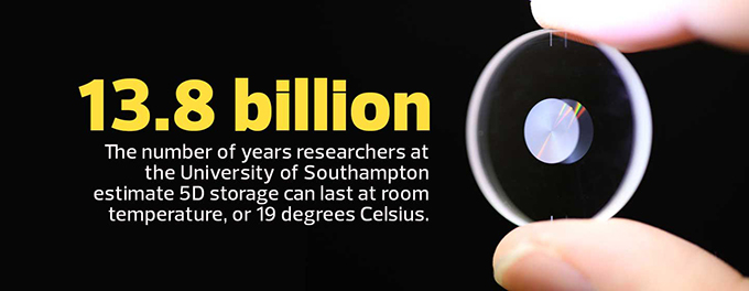 Scientists at the University of Southampton’s Optoelectronics Research Centre (ORC) used nanostructured glass to develop a storage media that can hold up to 360 terabytes of data at up to 1,000 degrees Celsius, and a virtually unlimited lifetime supply of data at room temperature.