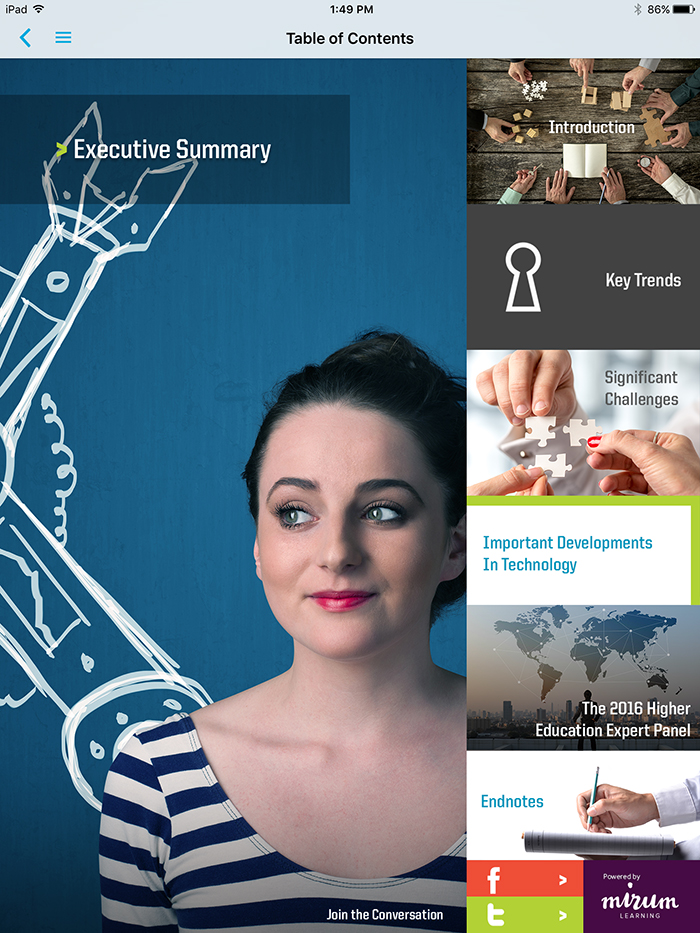 The Android and iOS app transforms the NMC Horizon Report: 2016 Higher Education Edition from a static, 56-page PDF into an engaging tool complete with video and embedded links.