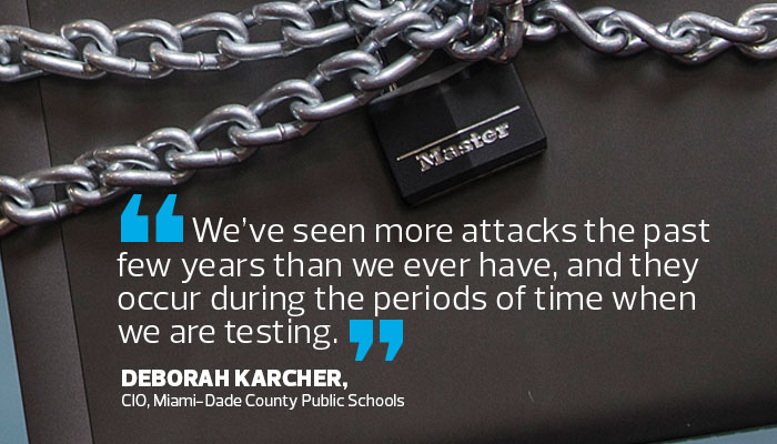 In Florida, Miami-Dade County Public Schools primarily gets hit by DDoS attacks during testing, Karcher says.